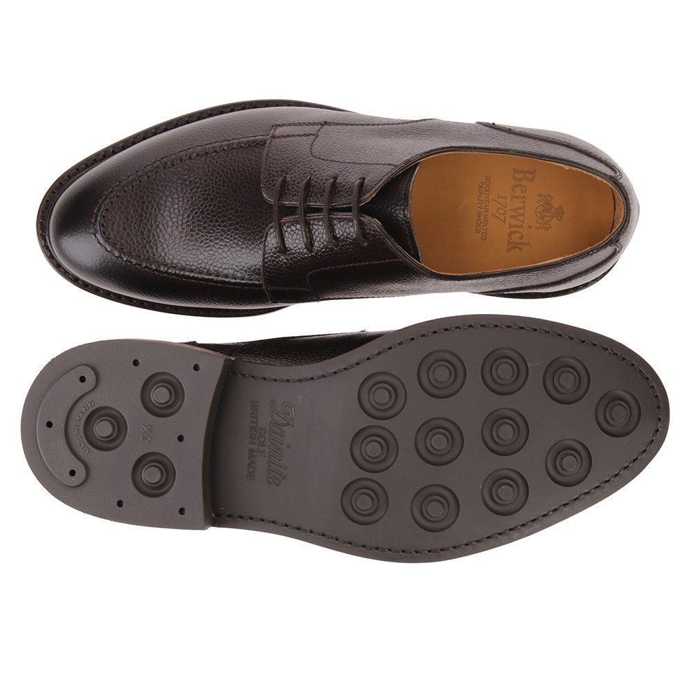 Zapato tipo Blúcher o Derby con bordón en pala realizado en Calf francés y piso inglés Dainite, con entresuela y tacón de cuero.