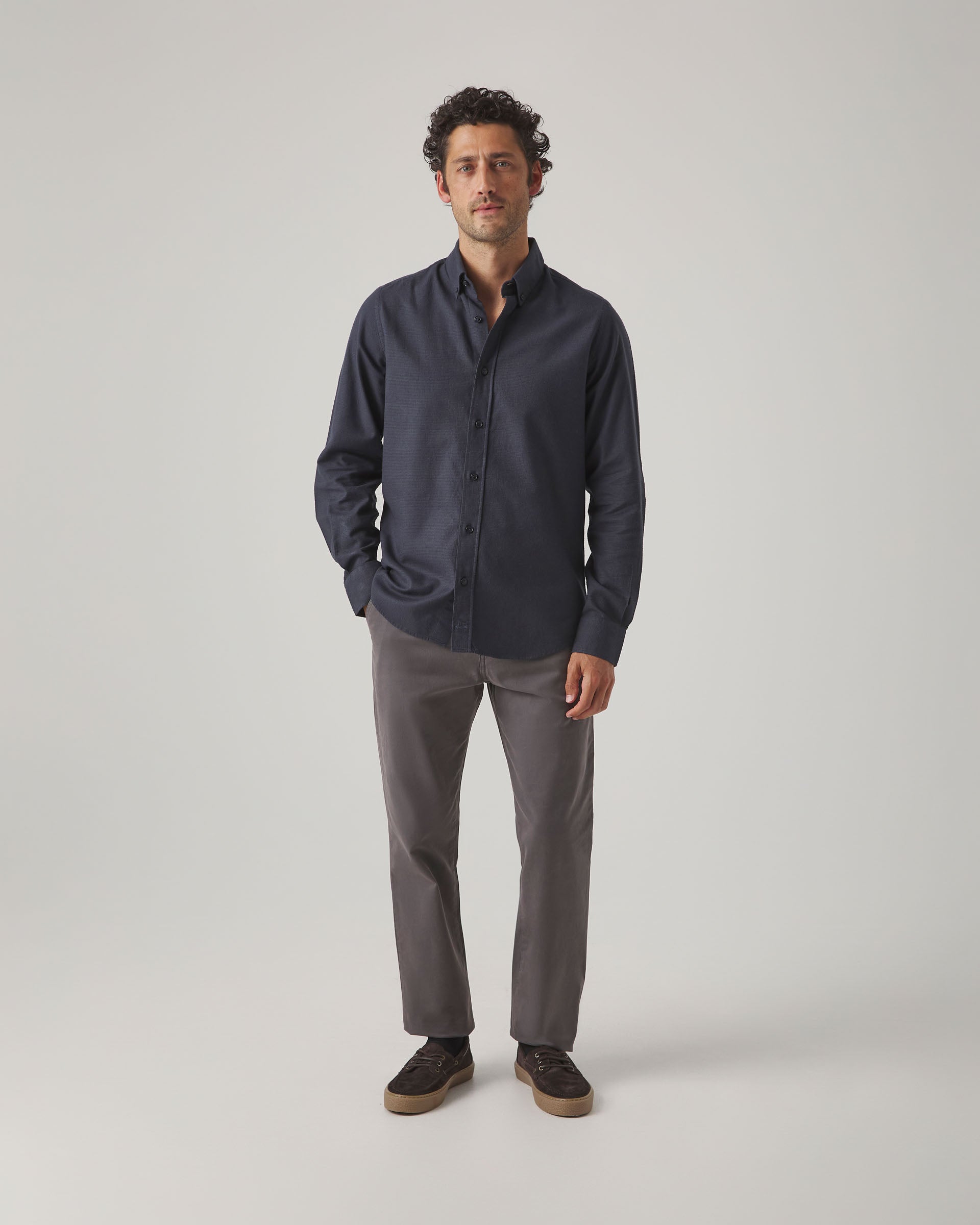 Camisa con estampado de pata de gallo en azul marino, confeccionada en algodón con corte regular fit. Diseño de cuello italiano, manga larga con puño abotonado y cierre frontal con botones personalizados. Detalle de moto bordada en el torso. Camisa ideal para oficina o eventos. Fabricada en Portugal