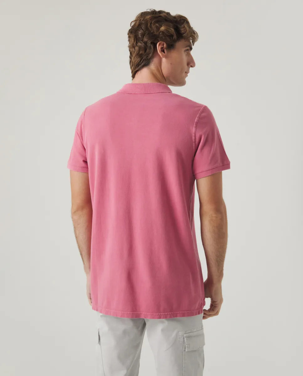 Polo liso rosa frambuesa de corte regular fit, confeccionado en algodón. Cuello con cierre de botones personalizados. Manga corta y acabado garment dyed: técnica que hace que el color, con el paso del tiempo y los lavados, adquiera un tono único. Moto bordada a tono en el torso. Fabricado en Portugal.