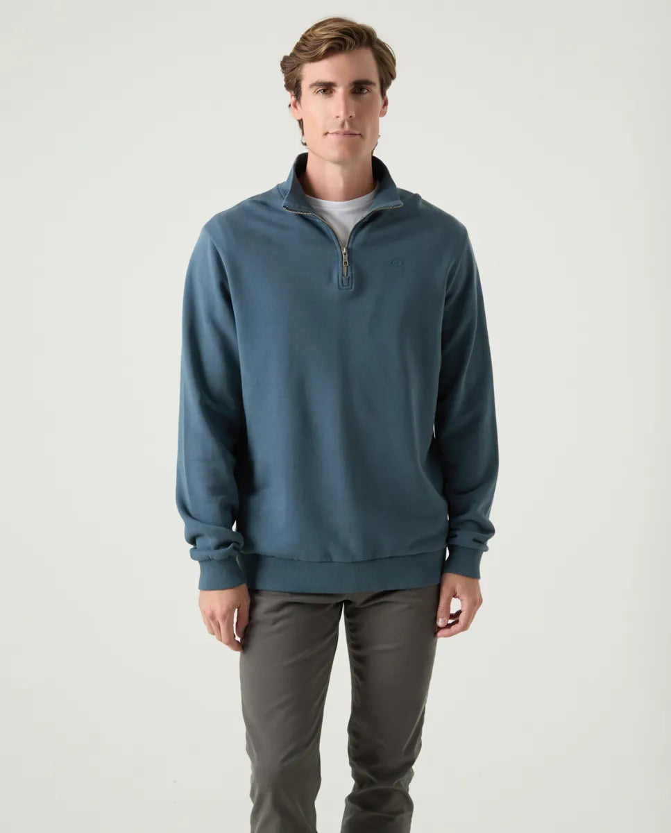 Sudadera en color azul grisáceo de corte regular fit, confeccionada en algodón para un tacto suave y cómodo. Cuello media cremallera, cuello subido, y manga larga. Detalle de moto bordada en el torso. Acabado garment dyed: técnica que hace que el color, con el paso del tiempo y los lavados, adquiera un tono único.