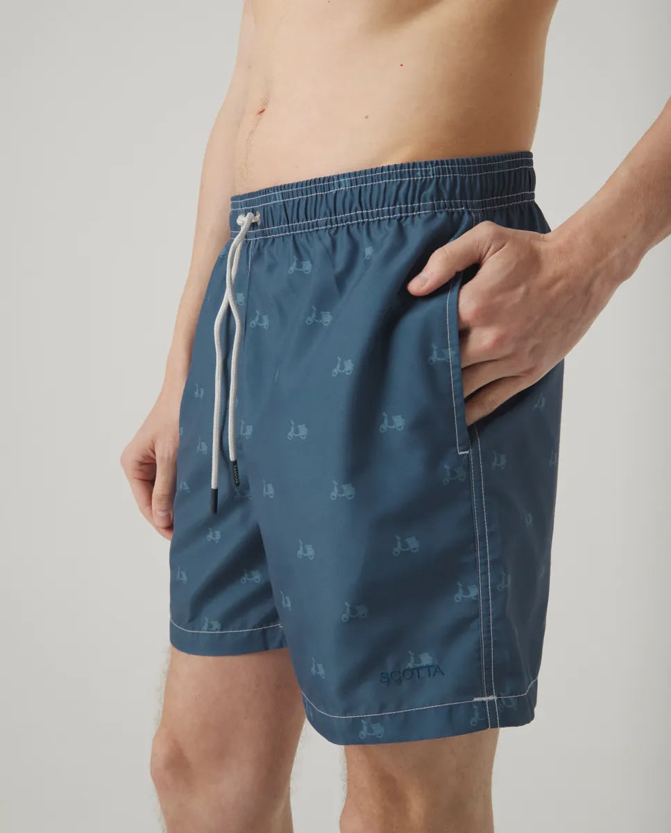 Bañador con logos de motos denim, confeccionado en poliéster. Cintura elástica con ajuste personalizado, interior de malla. Dos bolsillos delanteros y uno trasero con solapa. Detalle de letras Scotta bordadas.