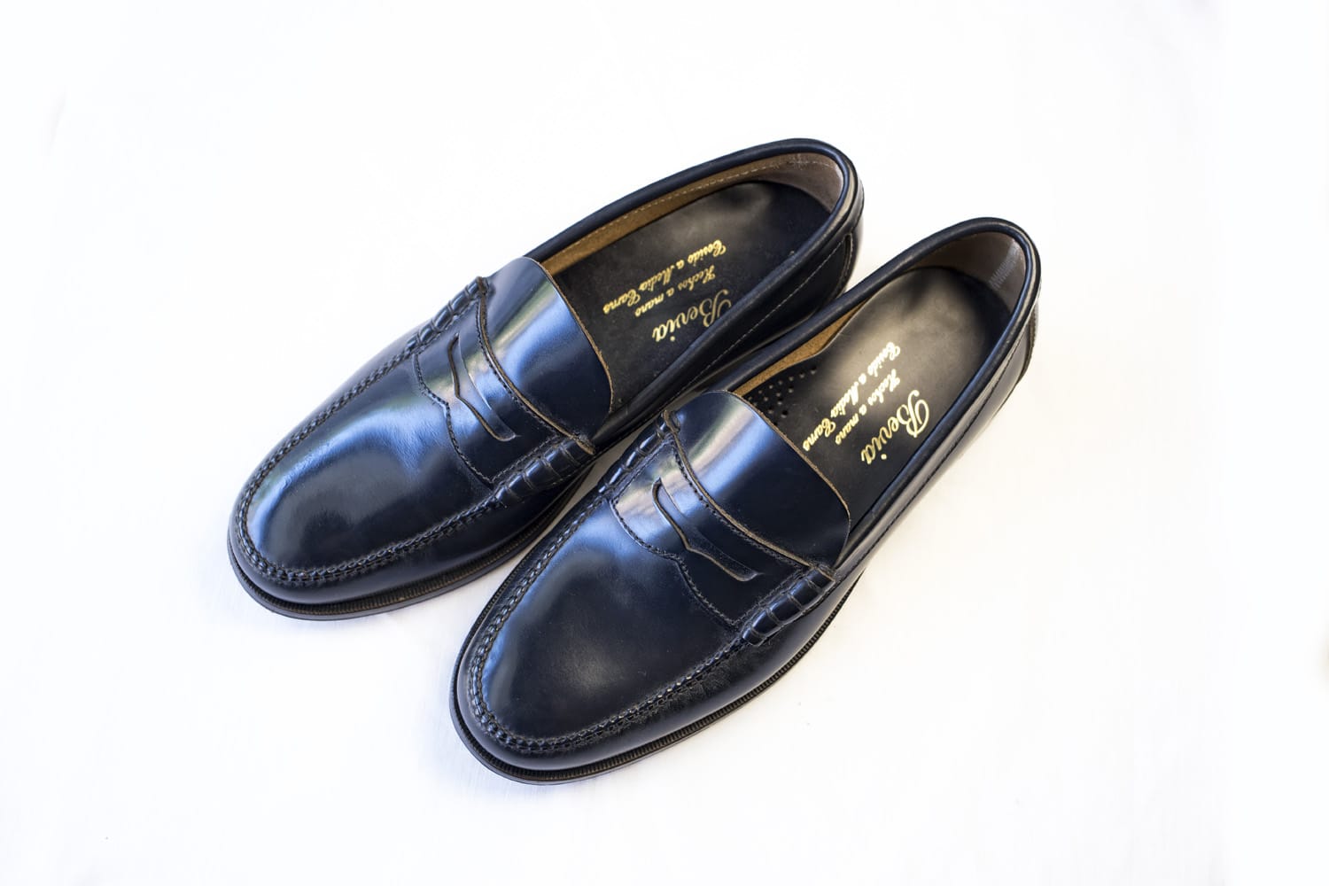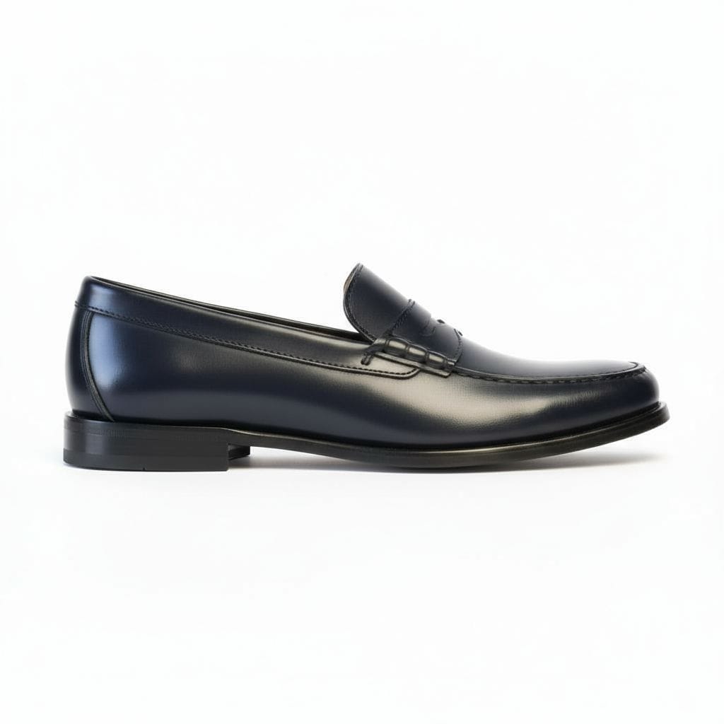 Mocasines clásicos para hombre de gran calidad fabricado en piel de color azul. Cosido a mano. Incorpora un detalle antifaz tipo americano. Suela 100% de cuero