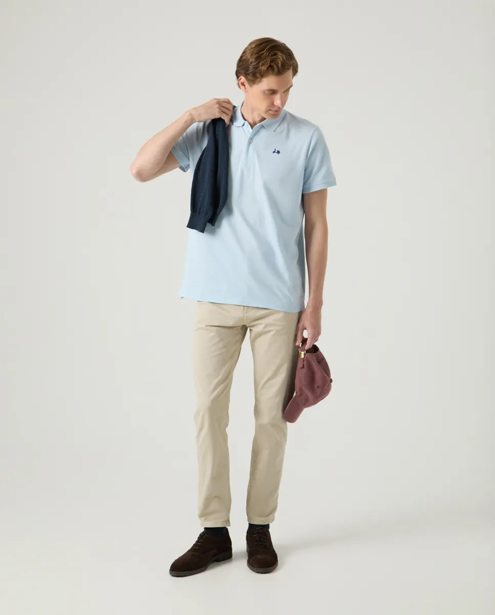 Polo clásico azul celeste de corte regular fit, confeccionado en algodón. Diseño de cuello con cierre de botones personalizados y manga corta. Moto bordada a contraste en el torso. Fabricado en Portugal.