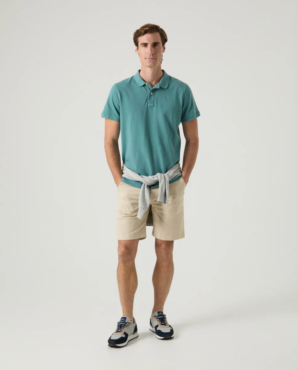 Polo liso azul océano de corte regular fit, confeccionado en algodón. Cuello con cierre de botones personalizados. Moto bordada a tono en el torso. Manga corta y acabado garment dyed: técnica que hace que el color, con el paso del tiempo y los lavados, adquiera un tono único. Fabricado en Portugal.